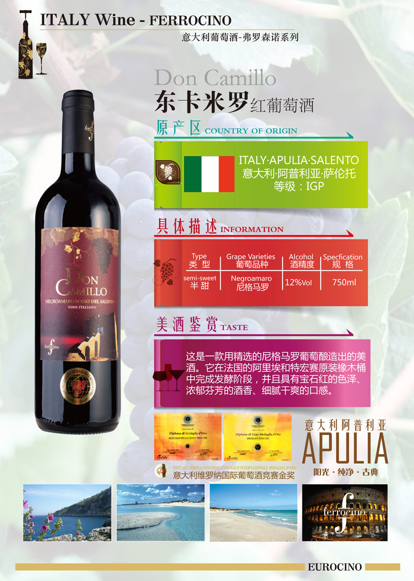類型:半甜demi-sweet 產區:薩倫托 SALENTO 等級:IGP 酒莊:弗羅森諾 年份:2013/2014 酒精度:12%vol 容量:750ml 葡萄品種:尼格馬羅 Negroamaro 品酒師推薦:這是一款用精選的尼格馬羅葡萄釀造出的美酒。它在法國的阿里埃和特宏賽原裝橡木桶中完成發酵階段,并且具有寶石紅的色澤、濃郁芬芳的酒香、細膩干爽的口感。