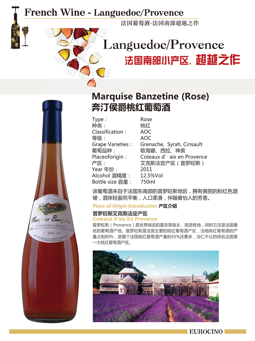 類型:桃紅葡萄酒 Rose 產區: 普羅旺斯provence 等級:AOC 年份:2011 酒精度:12.5vol 容量:750ml 葡萄品種:歌海娜Grenache,西拉Syrah,神索Cinsault 品酒師品鑒:來自法國東南部的普羅旺斯地區,擁有美麗的粉紅色酒裙,酒體輕盈而平衡,入口柔滑,伴隨著怡人的芳香。